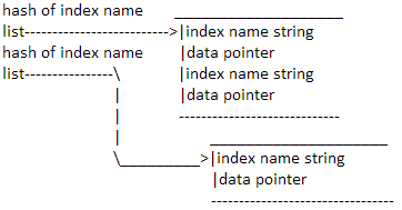 - Storage indexed by string the data saved is identified by an utf-8 string (called name). A hash is created out this name and is placed in a list. This hash identifies yet another list. This is a list with the names that have the same hash. Every name points to a different data pointer with the saved data.